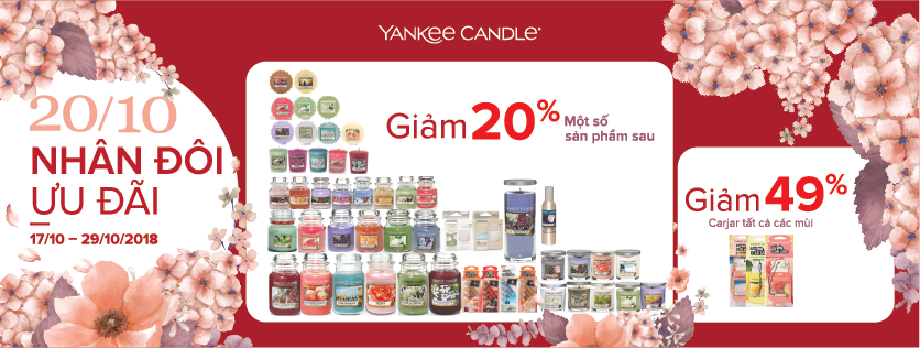Tháng 10, tháng của sự sẽ chia, là tháng mà bạn cần trao tặng cho những người phụ nữ xung quanh bạn những điều tốt đẹp nhất. Với tiêu chí mang đến cho quý khách hàng những trải nghiệm tuyệt vời nhất từ sản phẩm chất lượng. YANKEE CANDLE đã hưởng ứng ngày lễ này bằng một chương trình khuyến mãi hoành tráng “ 20/10 NHÂN ĐÔI ƯU ĐÃI” nhằm đáp ứng nhu cầu mua sắm tốt nhất cho quý khách hàng trong những ngày vui lễ.