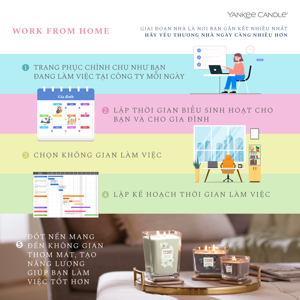 Không gian là nơi vô cùng quan trọng, ảnh hưởng trực tiếp vào quá trình và hiệu quả công việc. Một không gian thơm mát, dễ chịu sẽ giúp tinh thần sảng khoái, tăng tập trung và có thể kích thích nhiều ý tưởng mới. Vậy nên trước khi bắt tay vào công việc hãy thắp lên hũ nến thơm mỗi phút giây làm việc trở nên thú vị hơn bạn nhé.