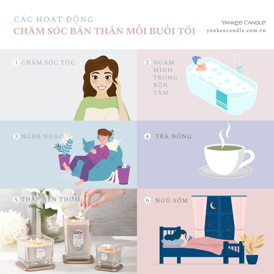 Chăm sóc bản thân không hề khó mà cũng chẳng tốn của bạn quá nhiều thời gian, chỉ đơn giản là sống chậm lại và lắng nghe tiếng nói của cơ thể. Sau đây là 6 hoạt động bạn có thể thự hiện tại nhà mỗi tối để chăm sóc yêu thương bản thân nhiều hơn.