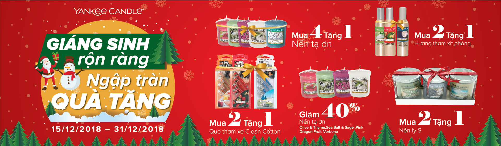 Giáng sinh này, bạn đã chuẩn bị gì cho những người thân thương của mình chưa?. Nhân dịp tháng cuối năm và mùa Noel đang đến gần. YANKEE CANDLE luôn thấu hiểu và mong muốn mang đến cho quý khách hàng những món quà đầy ý nghĩa để chào đón một mùa đông an lành và ấm áp bên gia đình bằng một chương trình khuyến mãi “ GIÁNG SINH RỘN RÀNG – NGẬP TRÀN QUÀ TẶNG” cực hấp dẫn, quà tặng siêu lớn. Qúy khách hàng sẽ có được những trải nghiệm thích thú mà sản phẩm chúng tôi mang lại.