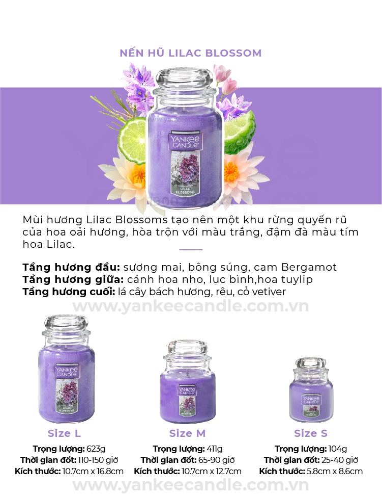 Mùi hương Lilac Blossoms tạo nên một khu rừng quyến rũ của hoa oải hương, hòa trộn với màu trắng, đậm đà màu tím hoa Lilac.