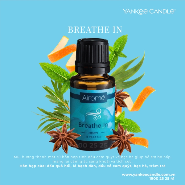 BREATHE IN: Mùi hương thanh mát từ hỗn hợp tinh dầu cam quýt và bạc hà giúp hỗ trợ hô hấp, mang lại cảm giác sảng khoái và tích cực.
