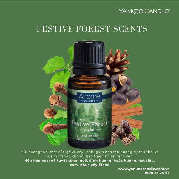 FESTIVE FOREST SCENTS: Mùi hương tươi mát của gỗ và cây xanh, giúp bạn tận hưởng sự thư thái và hòa mình vào không gian thiên nhiên bình yên.