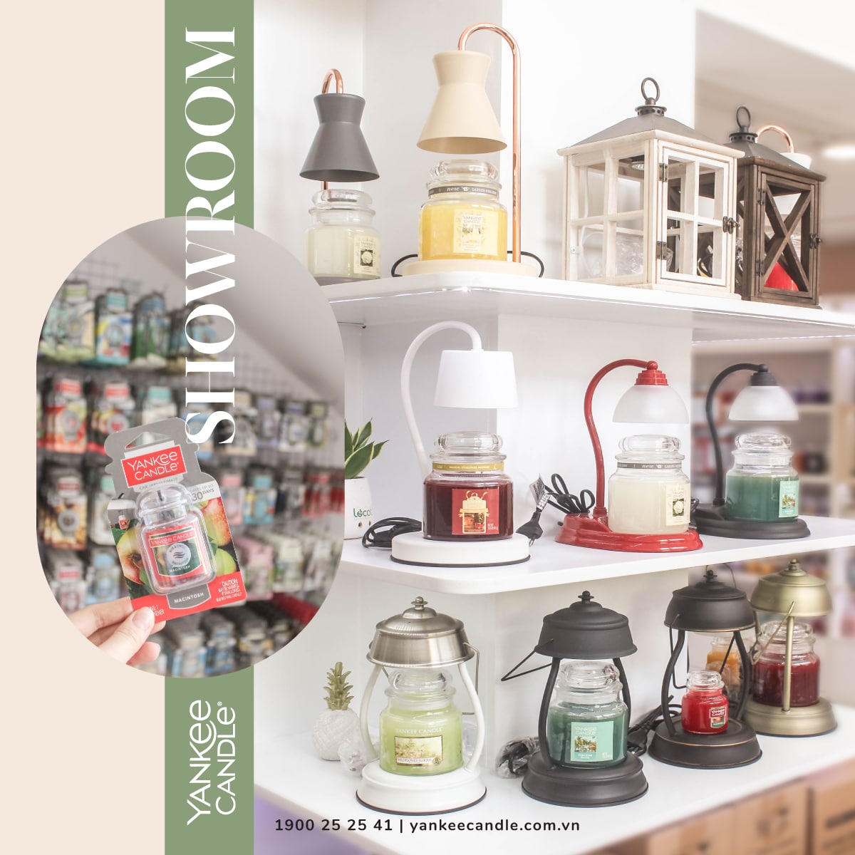 Showroom có sẵn tất cả các dòng sản phẩm làm thơm nhà Yankee. Cùng với bộ sưu tập hơn 60 mùi hương khác nhau để bạn thoải mái thẩm mùi và chọn ra sản phẩm làm thơm ưng ý nhất cho mình.