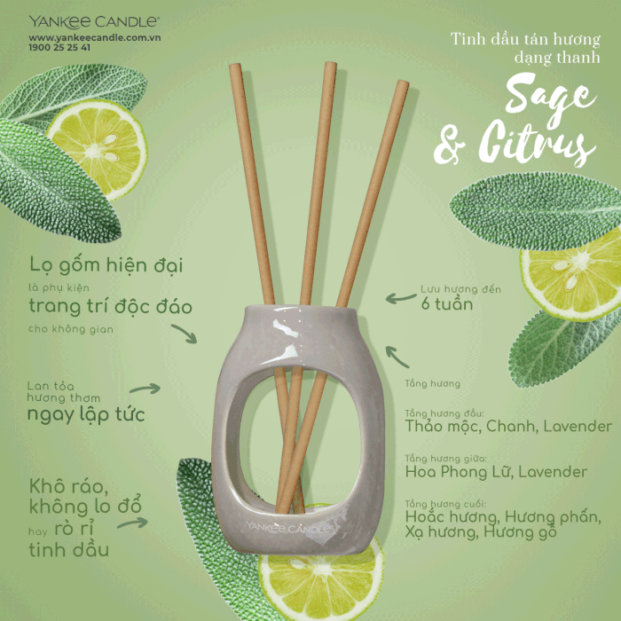 Sự pha trộn hài hòa của thảo dược quý, các loại hoa và chanh và hương gỗ trầm ấm, Sage & Citrus tạo nên hương thơm sang trọng và cuốn hút cho không gian.
