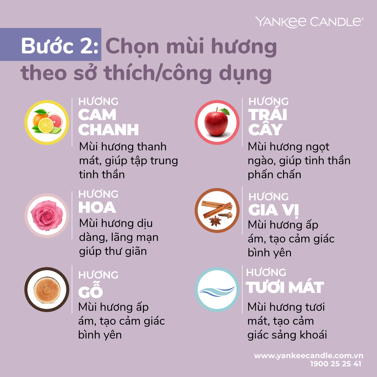 Mùi hương là yếu tố quan trọng nhất mà bạn cần cân nhắc khi chọn mua nến thơm. Giống như nước hoa, nến thơm cũng sở hữu nhiều tầng mùi hương tinh tế. Mỗi mùi hương sẽ có một tác dụng khác nhau. Vậy nên bạn hãy xem công dụng của từng nhóm mùi trước, sau đó mới chọn ra mùi hương phù hợp với nhu cầu của mình nhé.