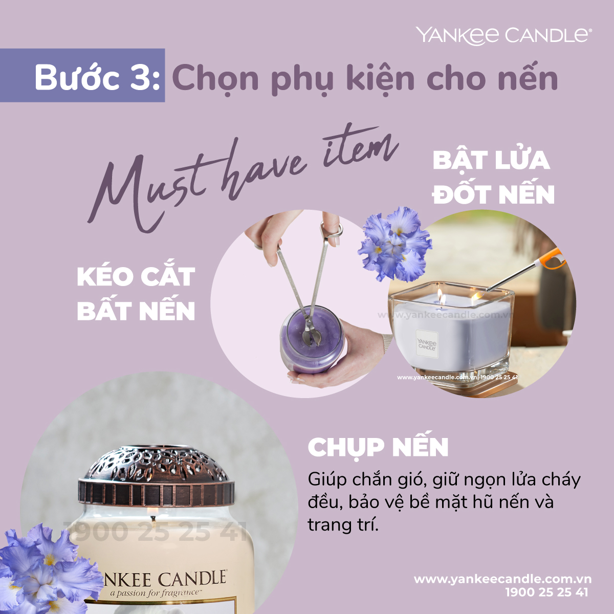 Sau khi đã chọn được hũ nến ưng ý thì đừng quên những món phụ kiện đi kèm nhé. Kéo cắt bấc nến và chụp nến trang trí sẽ giúp chăm sóc hũ nến tốt hơn và kéo dài thời gian sử dụng của nến. Còn bật lửa đốt nến chuyên dụng sẽ giúp bạn đốt nến an toàn và dễ dàng hơn.