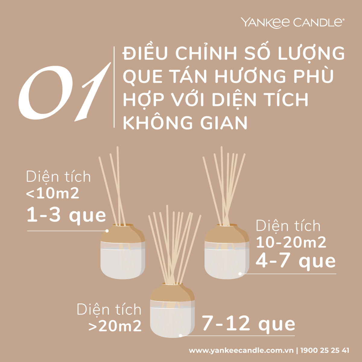 Que tán hương có thể lưu giữ hương thơm lên đến 10 tuần và độ khuếch tán hương thơm ở diện tích rộng. Vậy nên sẽ thật lãng phí nếu bạn sử dụng hết tất cả các que tán hương cho mọi không gian. Tùy theo diện tích không gian mà hãy điều chỉnh số lượng que tán hương phù hợp để kéo dài tối đa thời gian sử dụng nhé:
