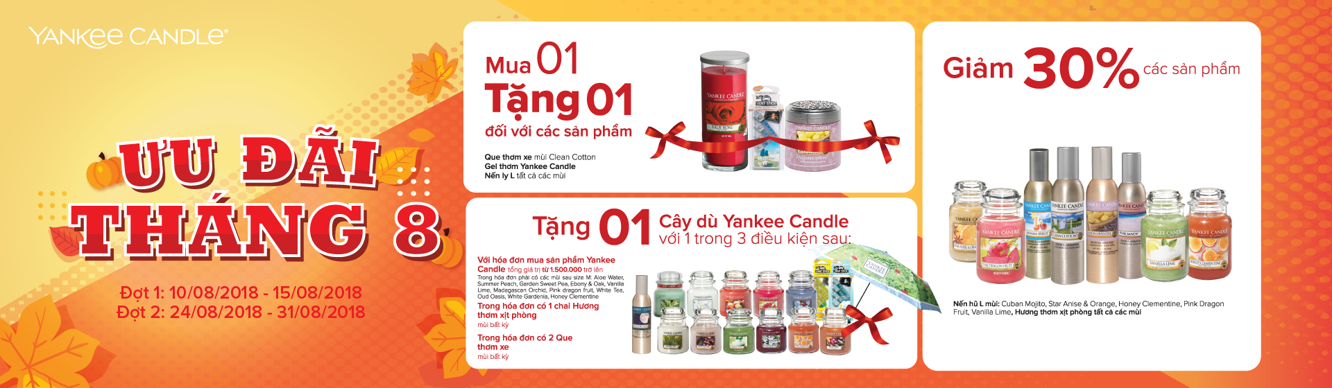Tháng 8, tháng của sự đổi mới, tháng cho những kế hoạch đột phá. Bạn đã sẵn sàng khám phá những điều mới mẻ, bạn muốn trở nên khác biệt và hiện đại hơn. Để góp phần lan tỏa mong muốn của quý khách hàng và nhân dịp thu sang, YANKEE CANDLE khởi động khuyến mãi cực lớn “ ƯU ĐÃI THÁNG 8” nhằm đáp ứng nhu cầu mua sắm của quý khách hàng. Đây sẽ là cơ hội để quý khách hàng có thể thỏa sức trải nghiệm những những sản phẩm cực chất lượng đến từ YANKEE CANDLE.